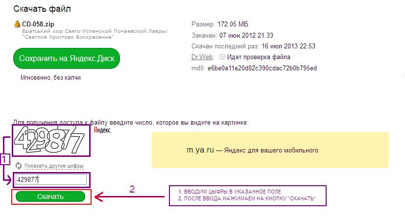 1. Скачивание с сайта http://narod.ru : В поле над кнопкой "Скачать" вводим цифры как показано на рисунку ниже, и уже после этого нажимаем на кнопку "Скачать"