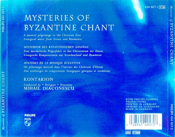 Предлагается альбом румынского хора "Контакион", посвященный византийскому распеву. Помимо церковных песнопений, исполненных в традиционной греко-византийской манере, также представлены авторские сочинения - например, отрывки из "Пасхальной оратории" Павла Константинеску. Также ряд песнопений полифонические, явно ощущается влияние западного стиля пения. Все песнопения поются на греческом языке.